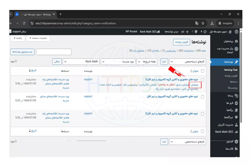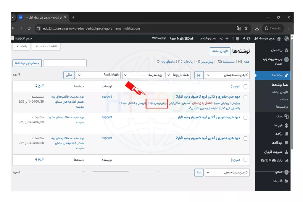 در لیست اطلاعیهها بروید، روی عنوان موردنظر بایستید تا گزینه ها ظاهر شود .