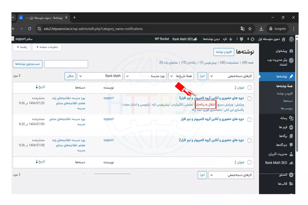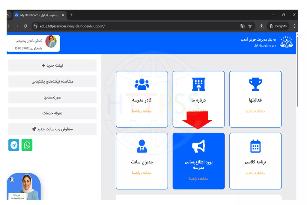 همانند دستور العمل بالا، پس از ورود به پنل مدیریت ،وارد بخش بورد اطلاع رسانی مدرسه شوید.
